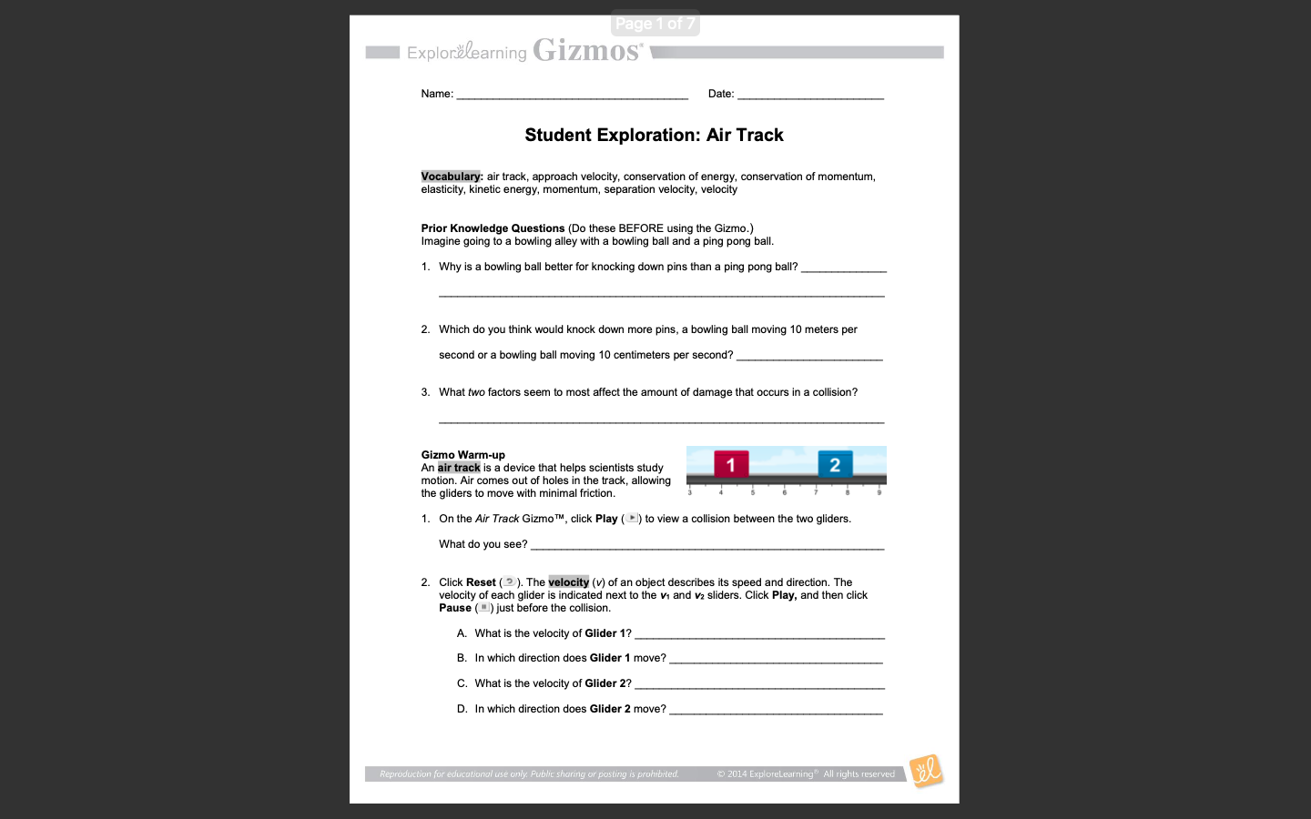 Student Exploration Air Track Answers Student Of Fortune from cdn11.bigcommerce.com Similarly, the speed at which the gliders are moving apart after the collision is described by the separation velocity. The maximum files size is currently set to 20971520 bytes. Turn off show numerical data for both gliders. Kinetic energy depends on both the mass and velocity of the object: Draw conclusions the principle of conservation of momentum states that in a course hero click reset. Turn off show numerical data for both gliders : Check that the elasticity is set to 1.0. Kinetic energy depends on both the mass and velocity of the object: